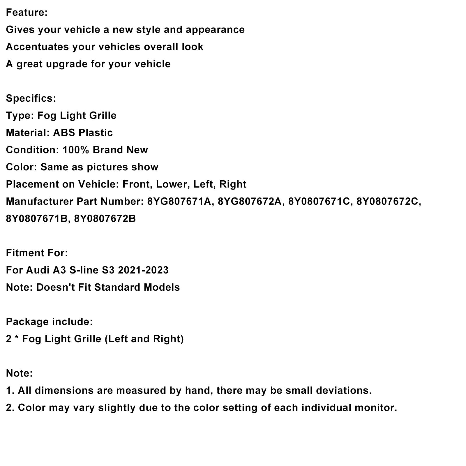 Manufacturer Part Number: 8YG807671A, 8YG807672A, 8Y0807671C, 8Y0807672C, 8Y0807671B, 8Y0807672B