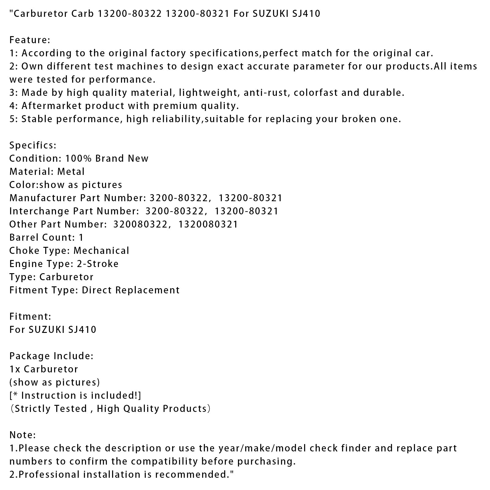 Carburetor Carb 13200-80322 13200-80321 For SUZUKI SJ410