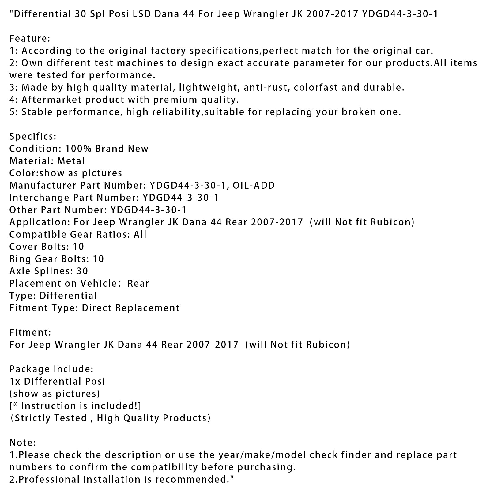 Differential 30 Spl Posi LSD Dana 44 For Jeep Wrangler JK 2007-2017 YDGD44-3-30-1