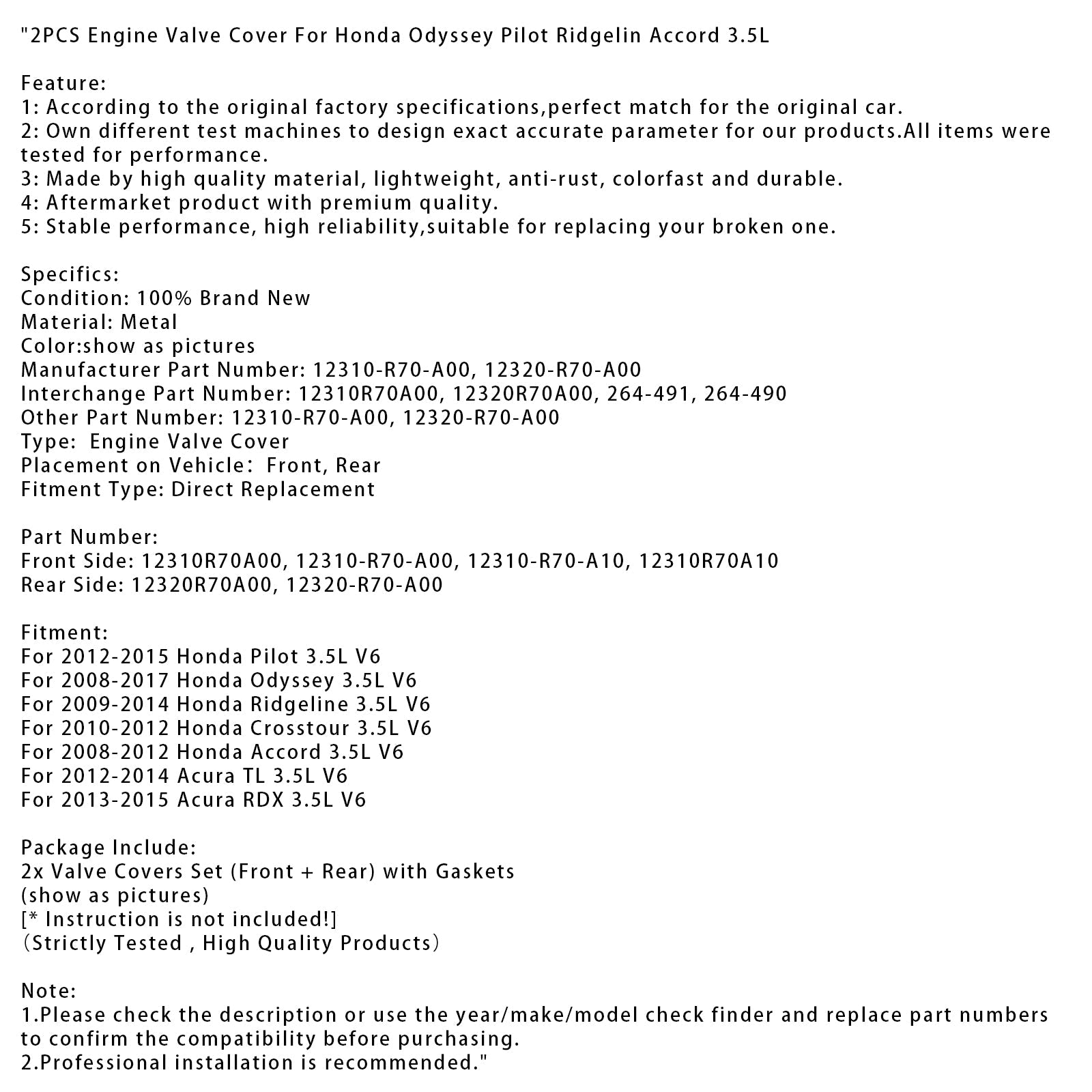 2PCS Engine Valve Cover For Honda Odyssey Pilot Ridgelin Accord 3.5L