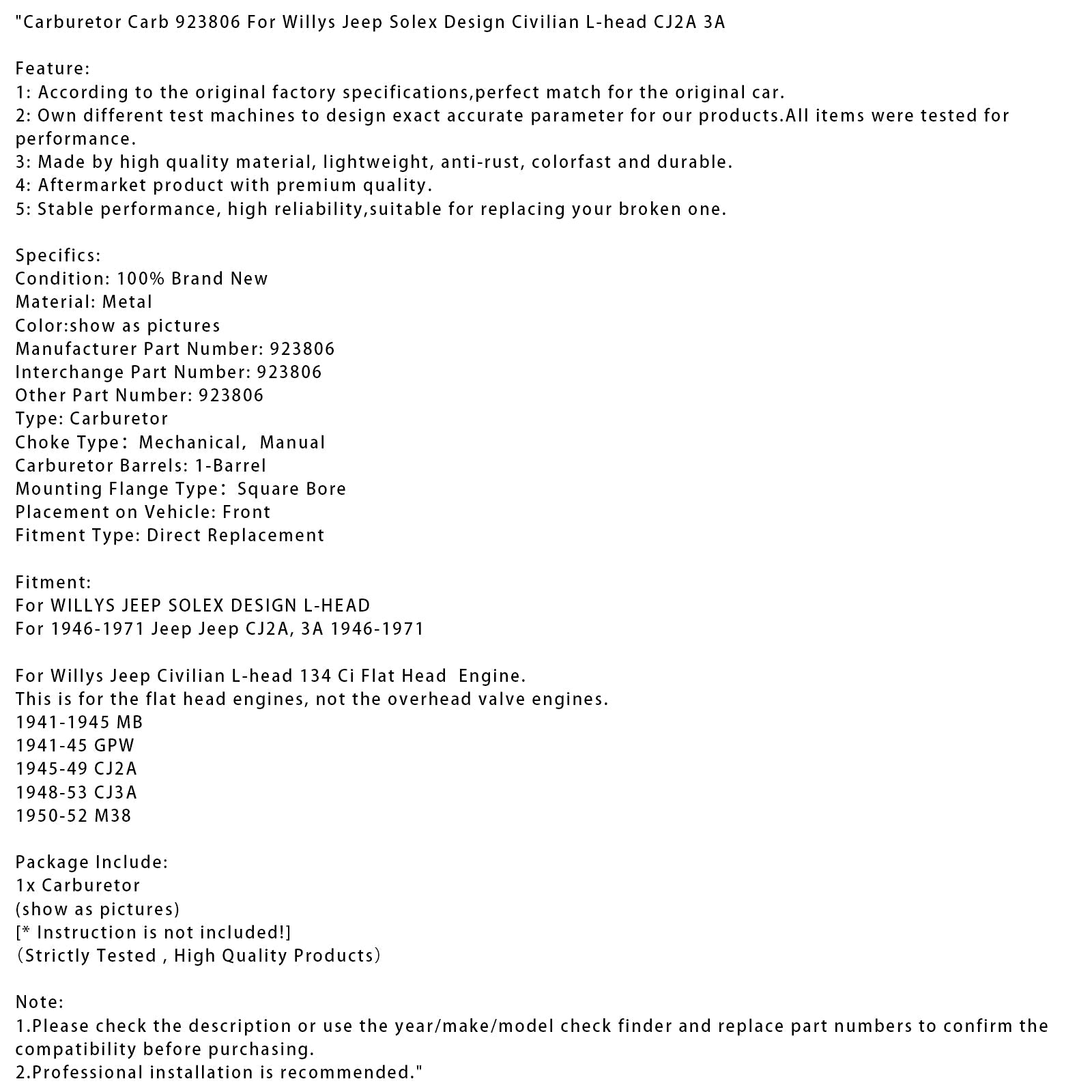 Carburetor Carb 923806 For Willys Jeep Solex Design Civilian L-head CJ2A 3A