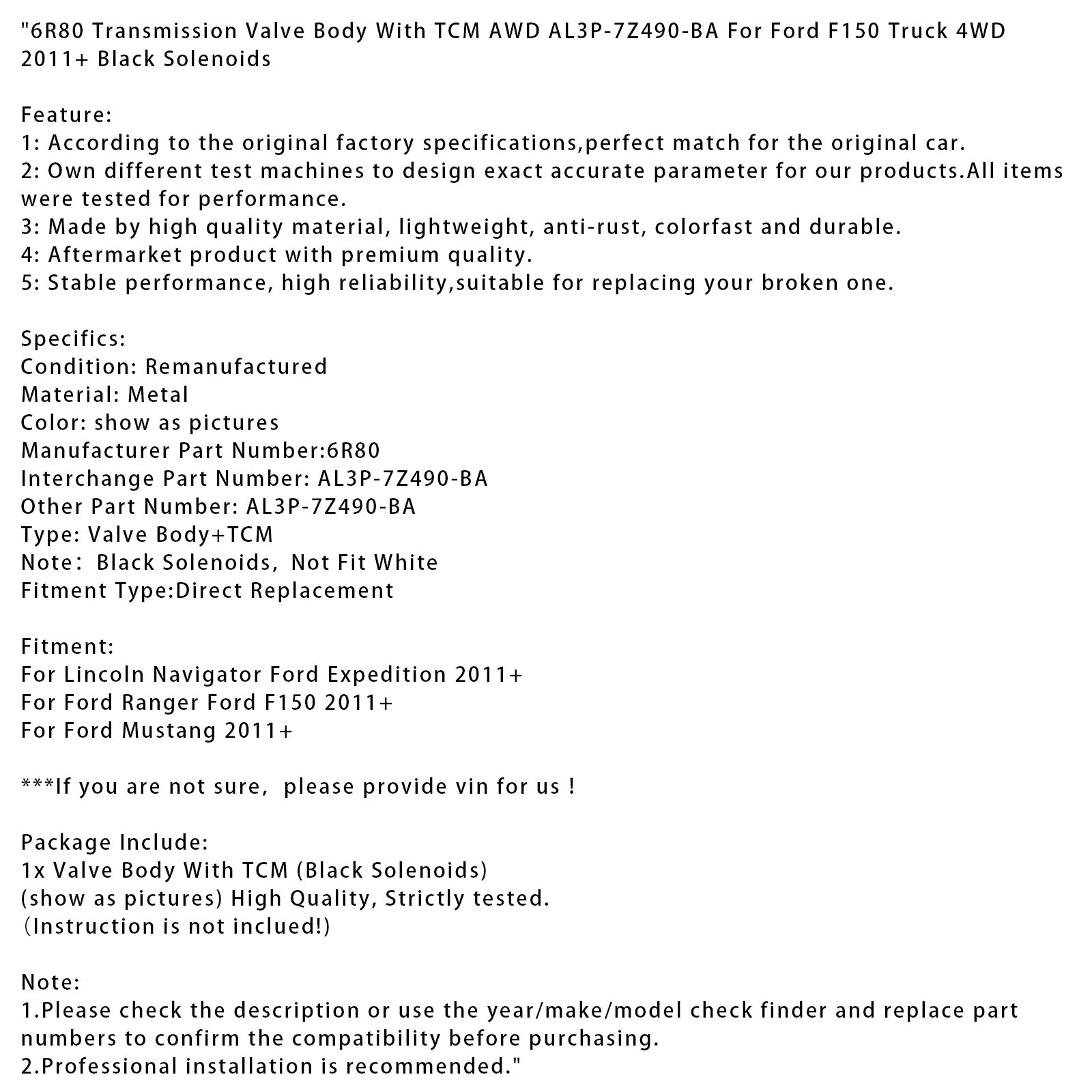 6R80 Transmission Valve Body With TCM AWD AL3P-7Z490-BA For Ford F150 Truck 4WD 2011+ Black Solenoids